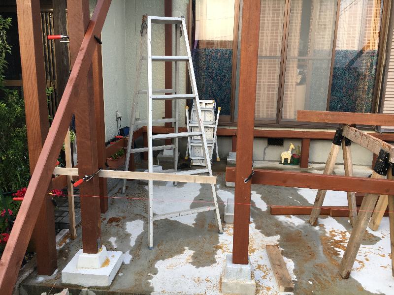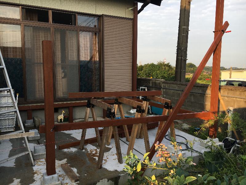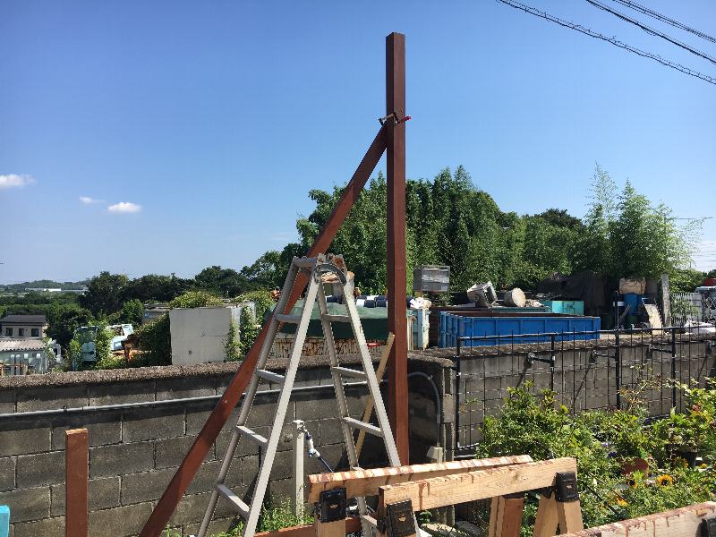 長柱を根太と幕板でカッチリ固定した後に立てます。