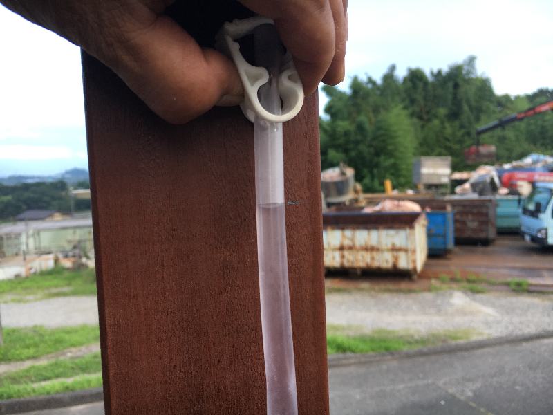 最後にデッキの4本柱に水盛り管で同一高さのマーキングを