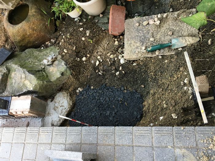 何処に来るのかを確認して土を漉き取り、路盤材を敷きました。