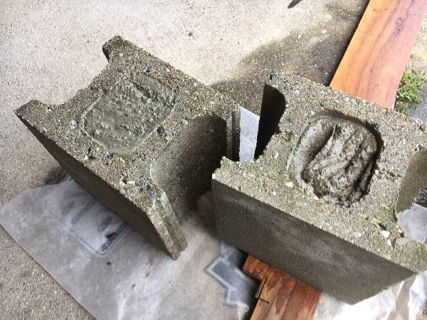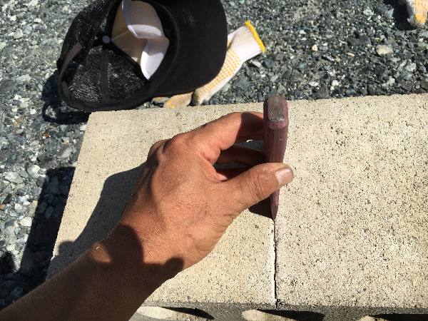 先ず、割ったブロックの凸凹にモルタル詰めて自重を大きく