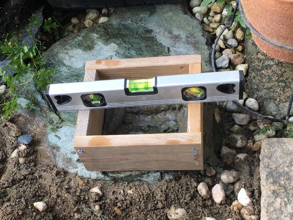 石にモルタルを載せ、そこへ枡をこのように水平器で確認しながら