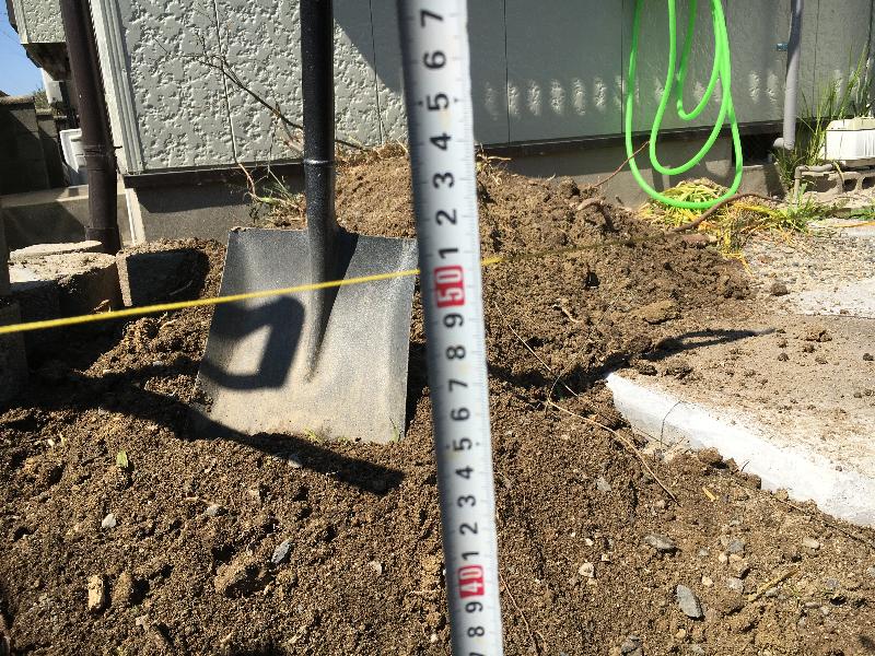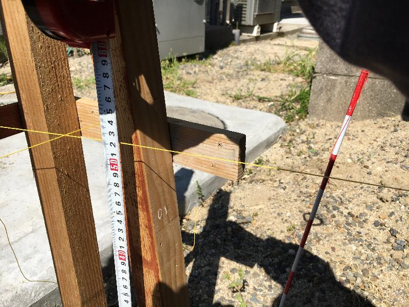 ですから足で踏み固めた段階では水糸からの下がり寸法が小さめに