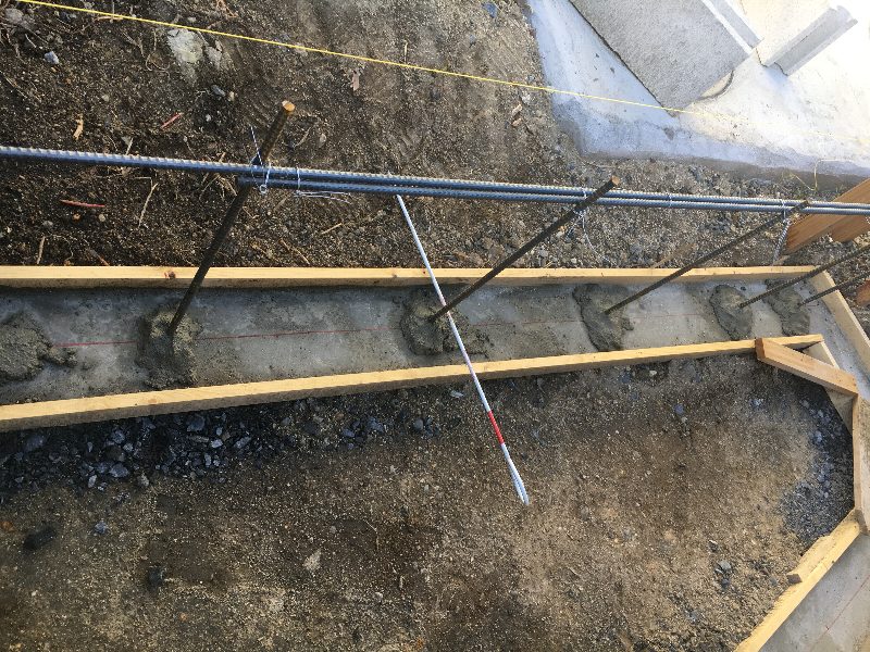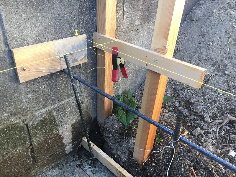 の貫き板に鉄筋を渡し、基礎とこの鉄筋に位置をマーキングして