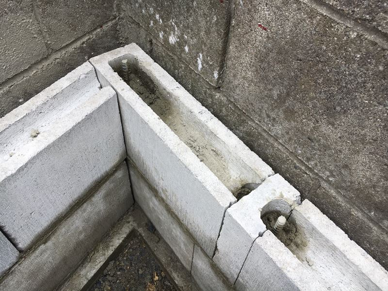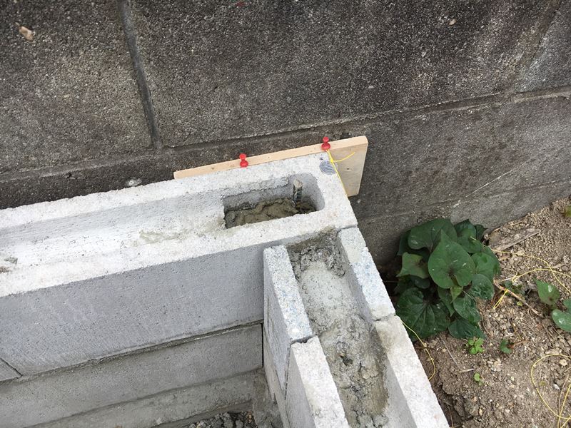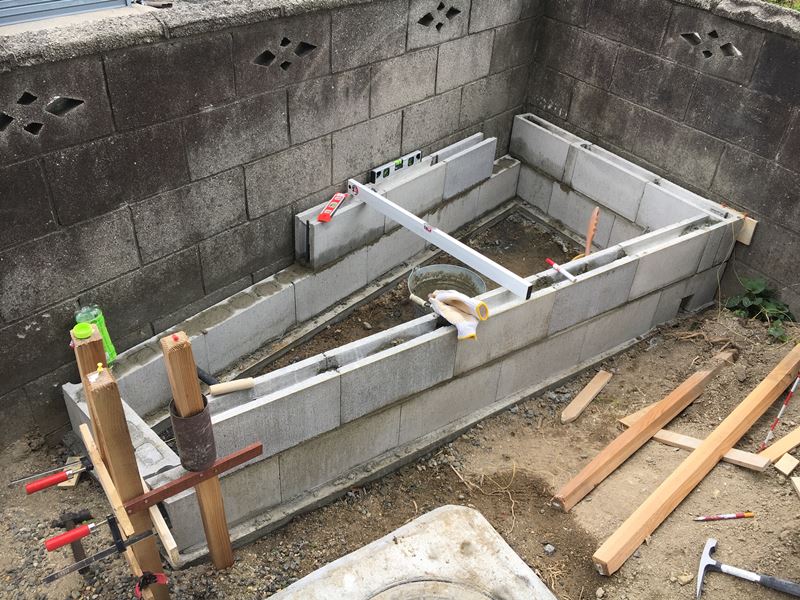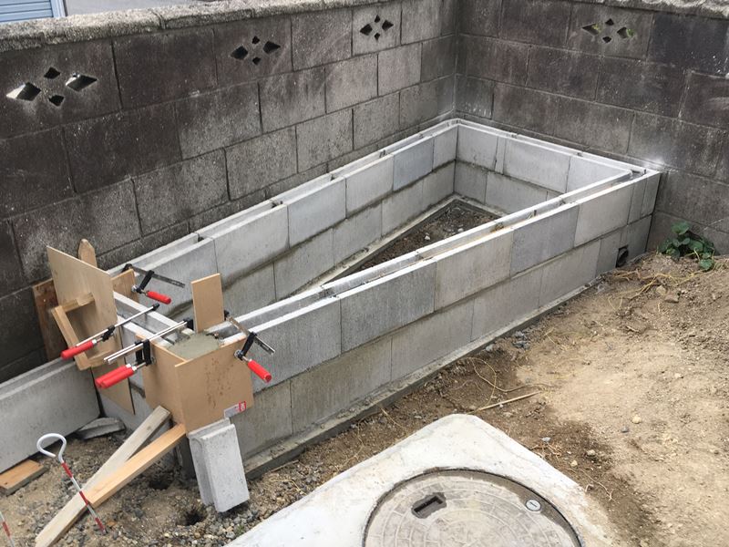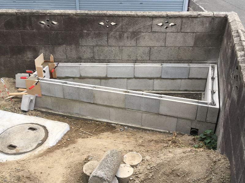 で、以前打ったコンクリート土間に立ってブロック花壇を