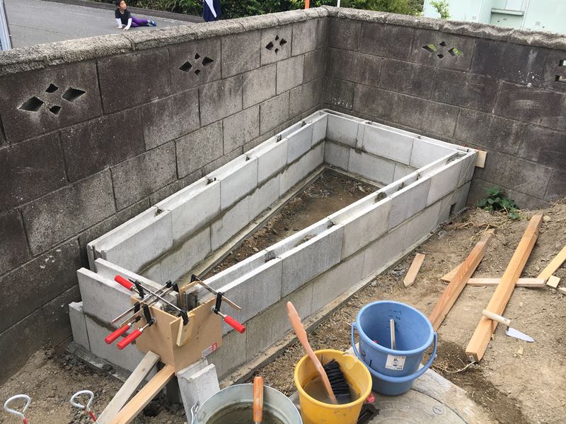 G.Wは天気が悪い中、ブロック花壇DIY真っ最中です。