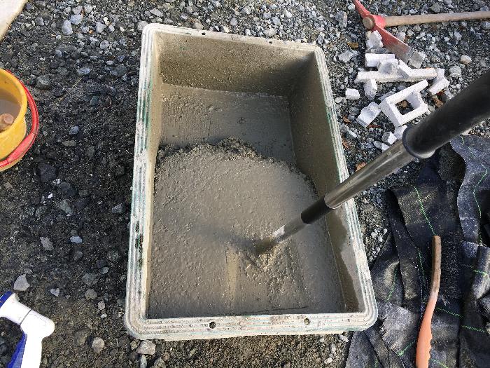 一回で練るコンクリートの量はセメント7Kgと砂20Kgを