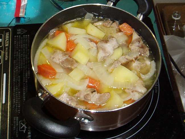 ジャガイモは芽を取って、皮を剥いて、であまり小さくすると煮込んだ後に形が無くなるからとのアドバイスに従って少し大きめに切りました。