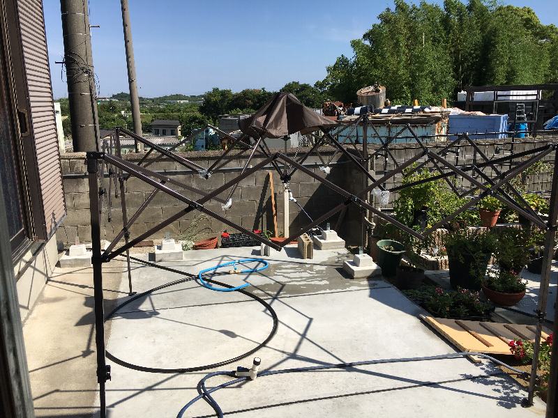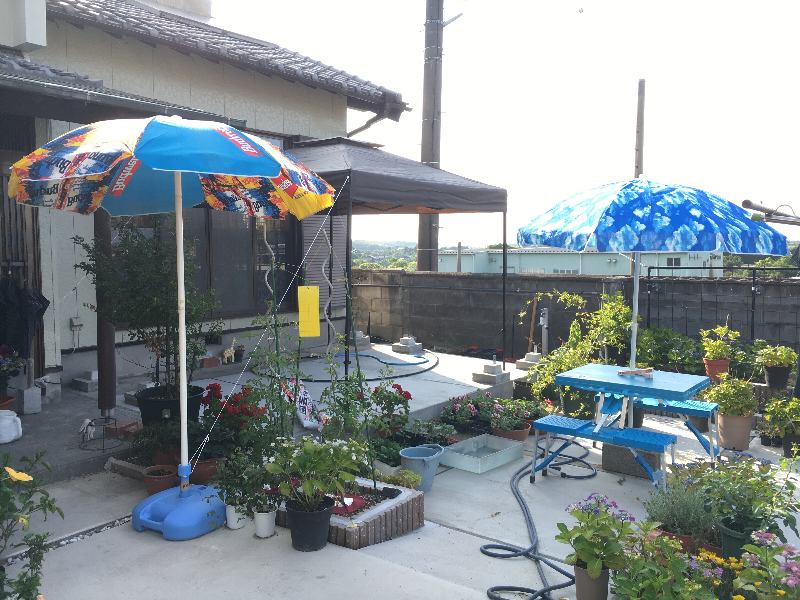 狭い庭で目一杯の設営。