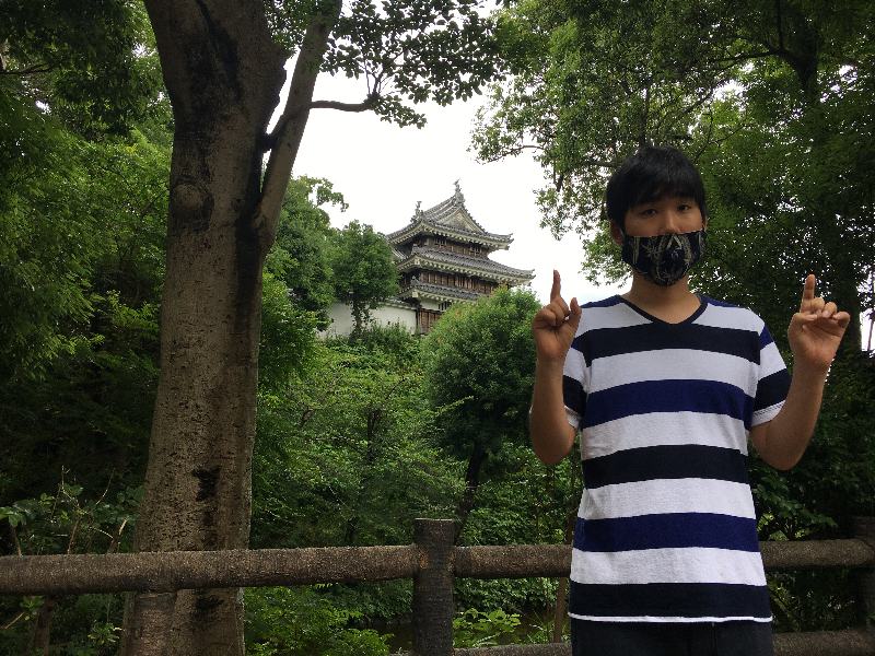 展望台として建立されたお城をバックに長男もポーズ。