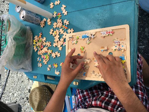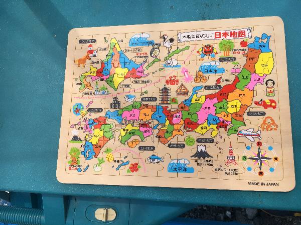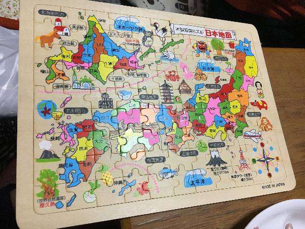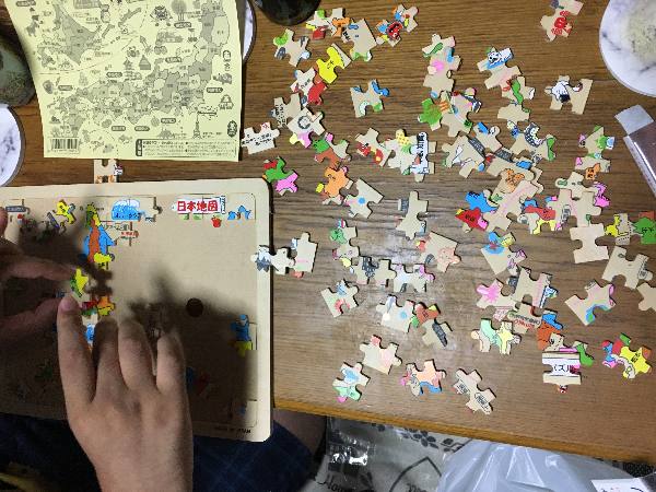 夕食の前の一時、ママが長男に日本地図のパズルをさせました。