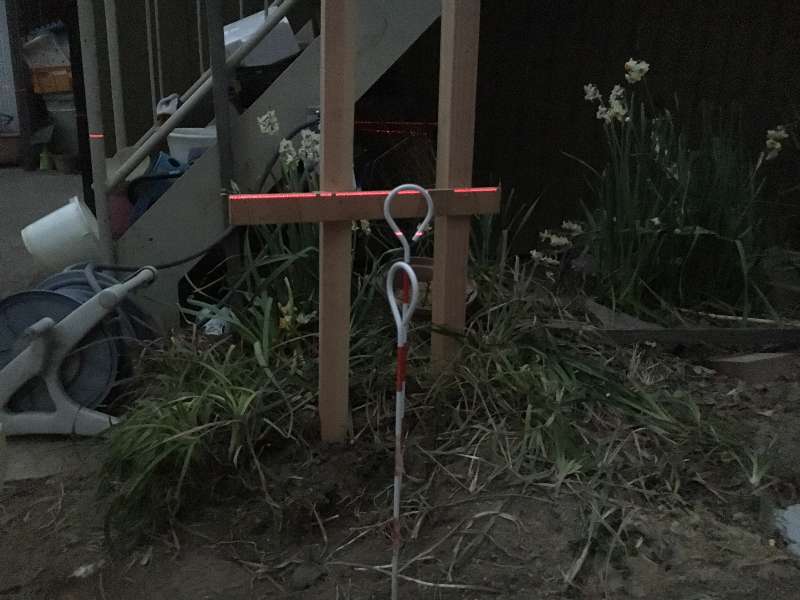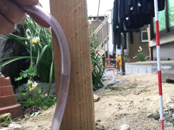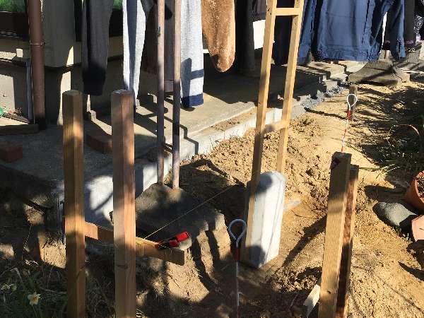 これをそのまま水勾配とし、杭を打って貫き板を貼りました。