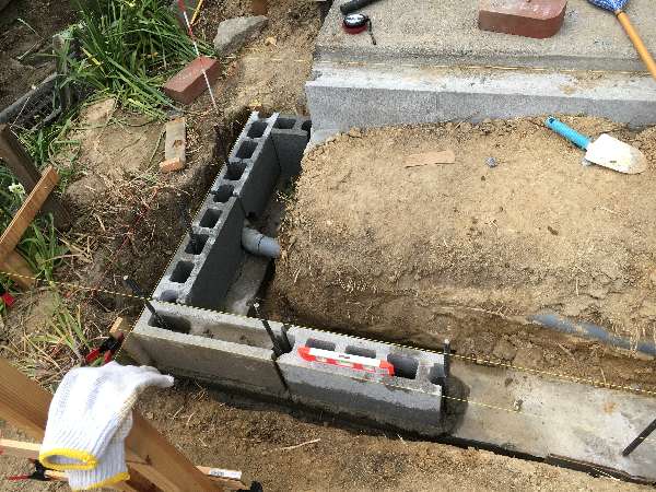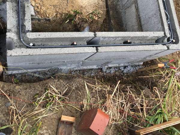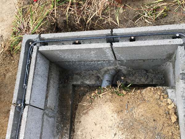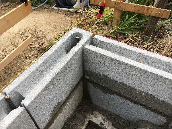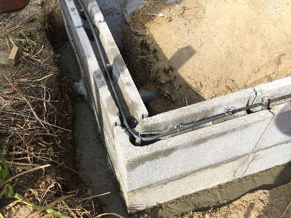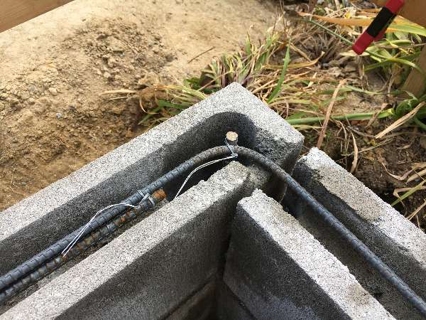 初めに積んだのはコーナーから。 鉄筋の位置とブロックの位置が