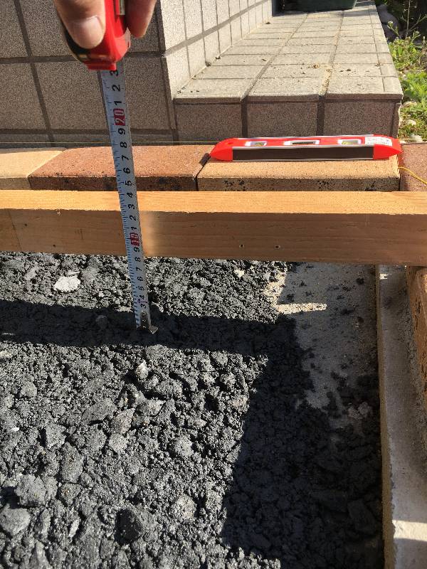 写真の数値は路盤材と枠レンガの距離を確認しているところで、