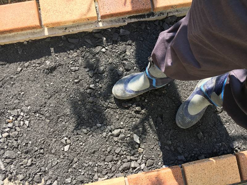 そうして、突き固めながら枠レンガからの下がり寸法を