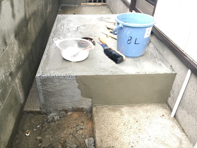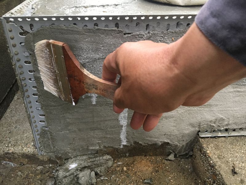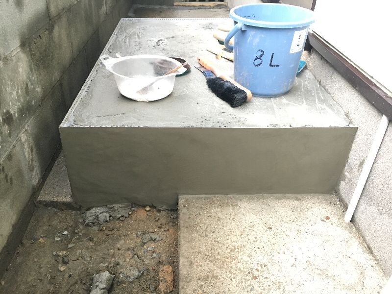 左写真はコーナー定規が貼ってある犬走り上の部分まで塗り付けた