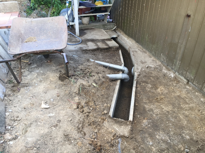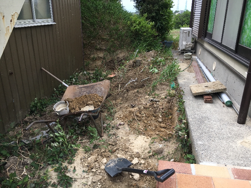 打ち、犬走り側は排水パイプを露出させない程度に盛り土して