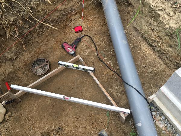 終点、そして右側は犬走り下の土に突き付けとしました。