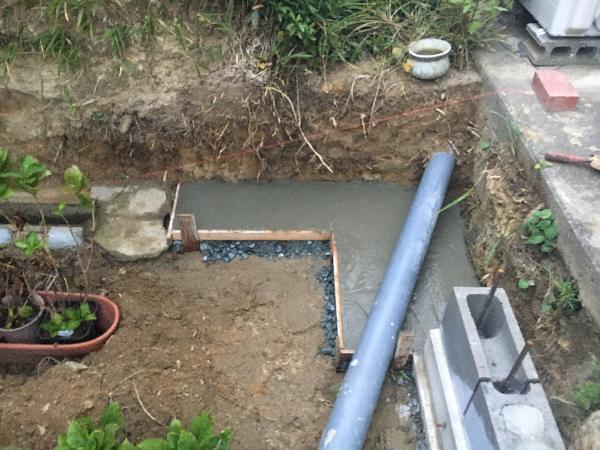 今回の捨てコン施工範囲は、左側が既存のガレージ裏側溝の