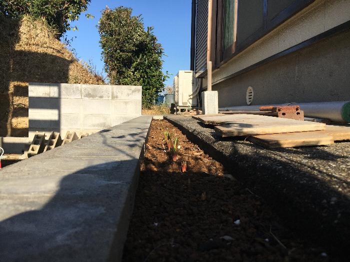 裏庭の土間コン、庭のレンガデッキや土留め、そしてガレージ裏の