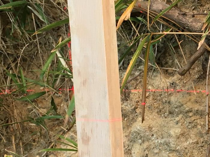 土手側に杭を打ち、反対側は既設のブロックに水糸を張るので
