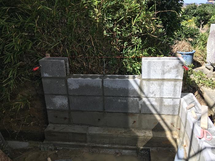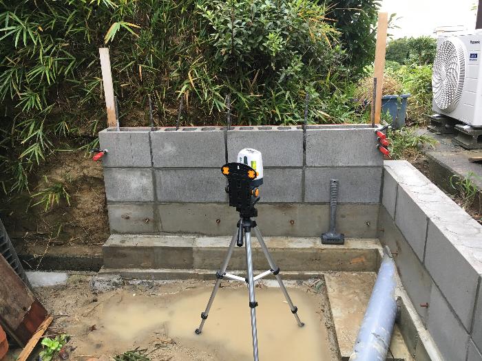 さて、今朝一番に2段目ブロックの天端レベルをチェック