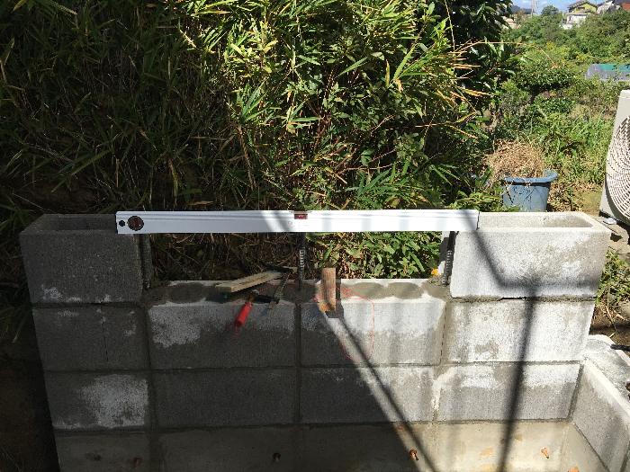 両端の3段目ブロックを設置して、水平器でレベルを確認しました。