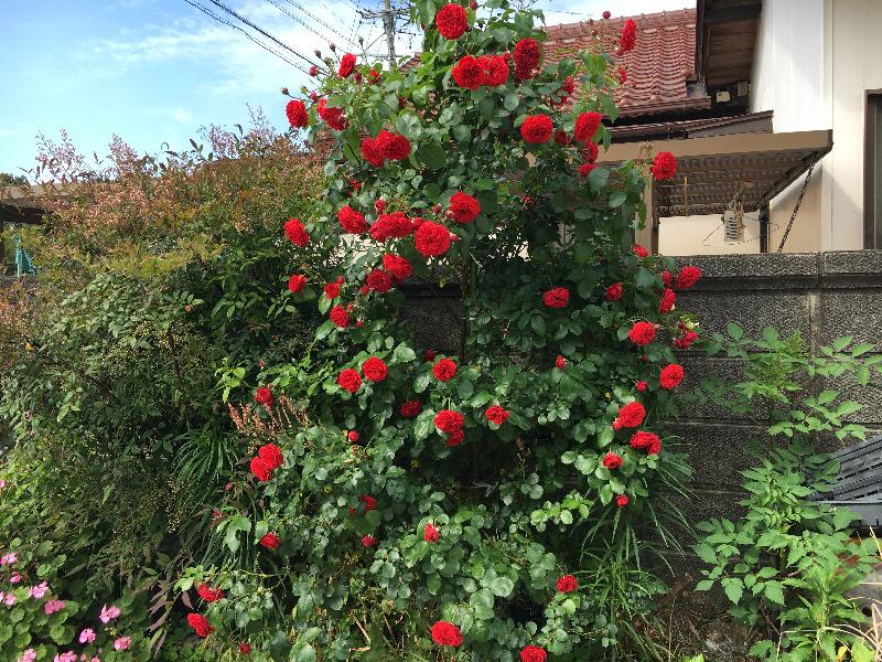 お隣さんとの境界ブロック塀の薔薇が見事に
