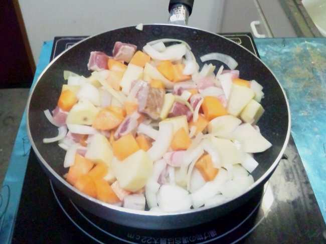 ジャガイモを切って皮を剥いて、ニンジンと玉ねぎも切って水洗い