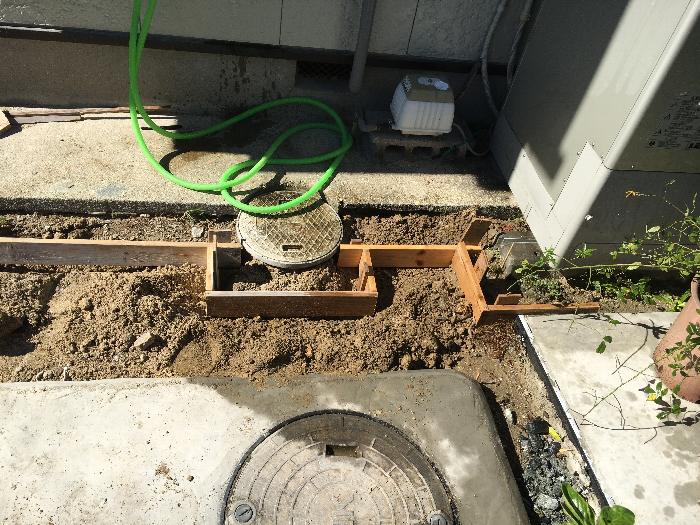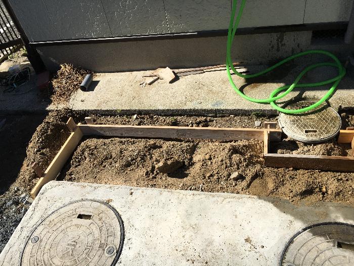 今回の打設エリアはL字型で、水流れはブロック塀側からこの
