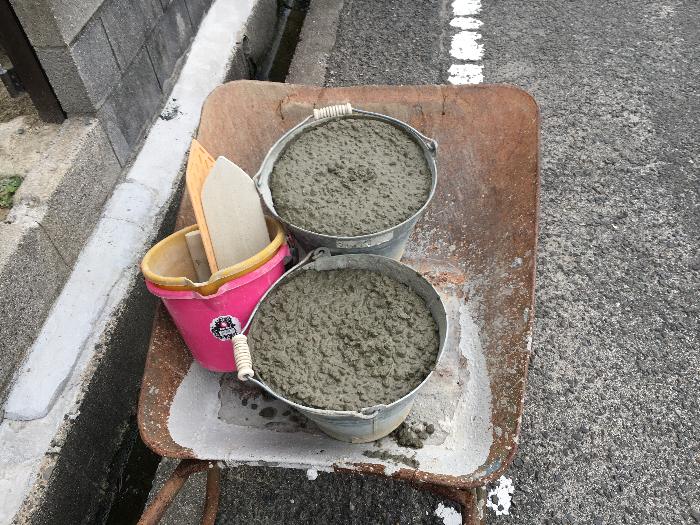 オモテ庭でミキサーを使用しての施工となりました。