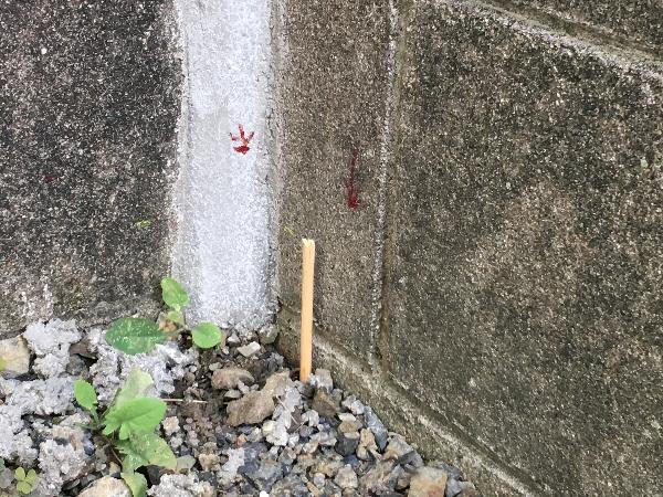 ブロック塀には水糸を張り、ついでに黄色のマーカーで印を