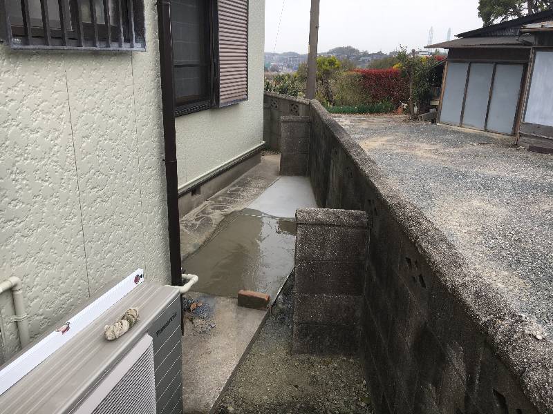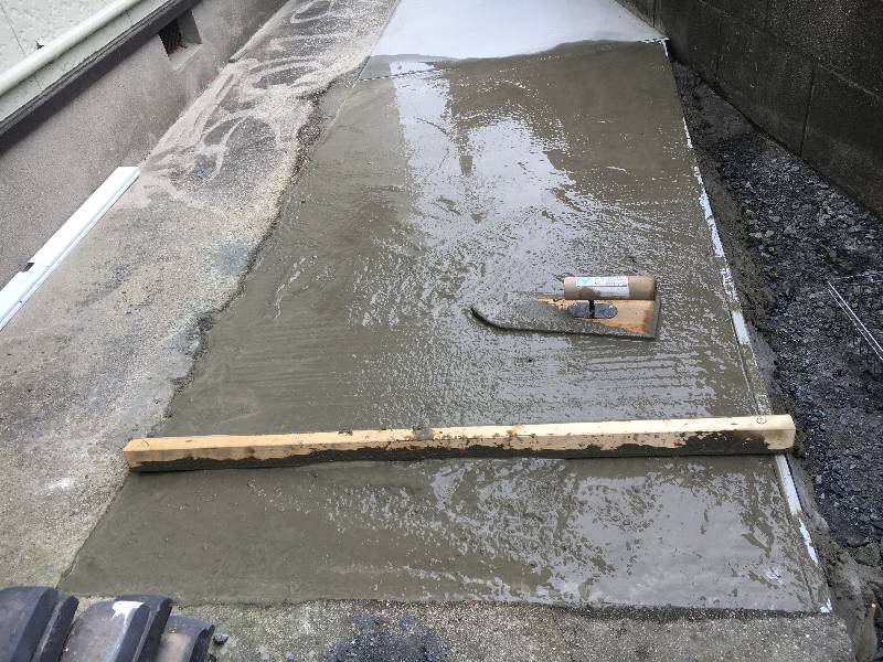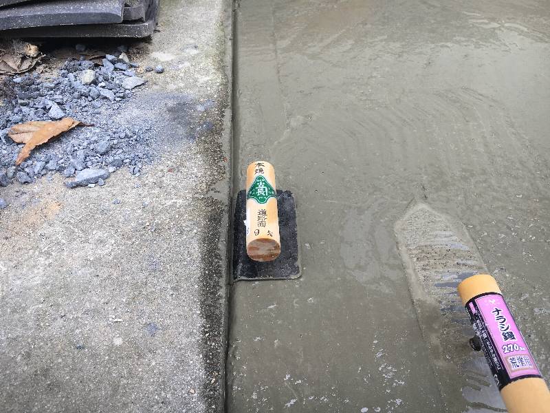 手が届く範囲しか鏝が使えません。塀側は次回打設予定の三角地帯から