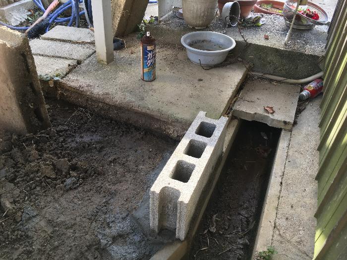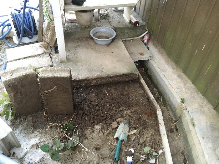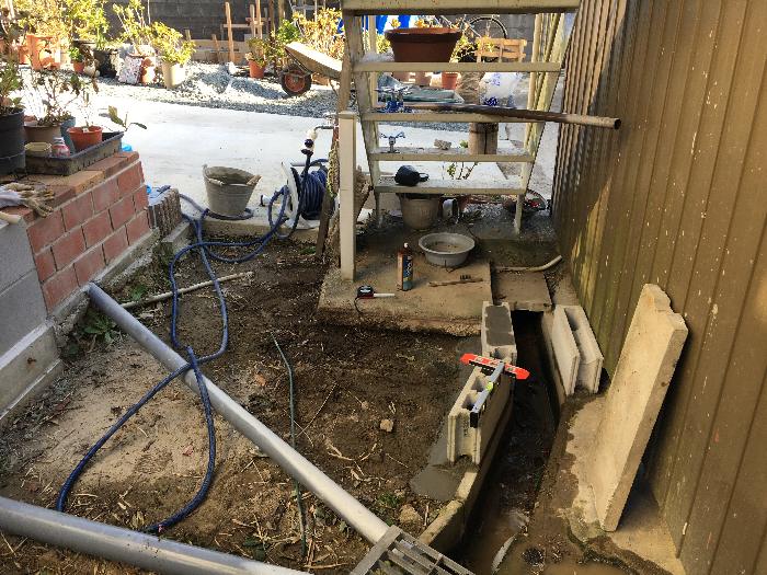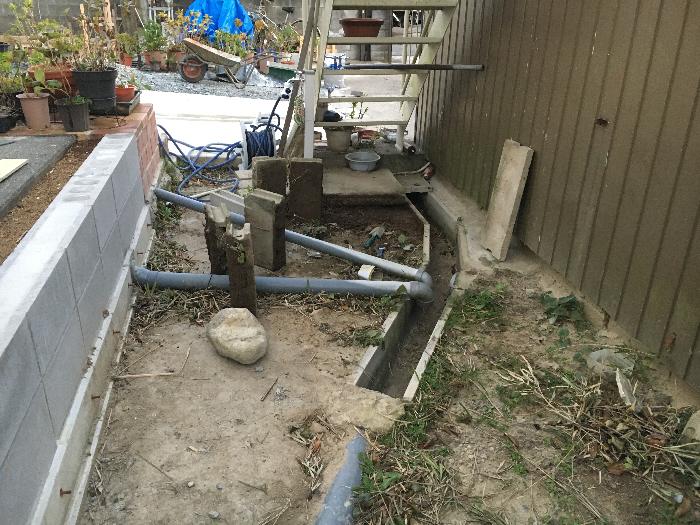 この露出している雨水配管よりも高いレベルまで地盤を上げる