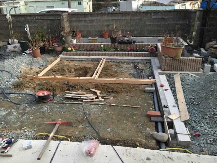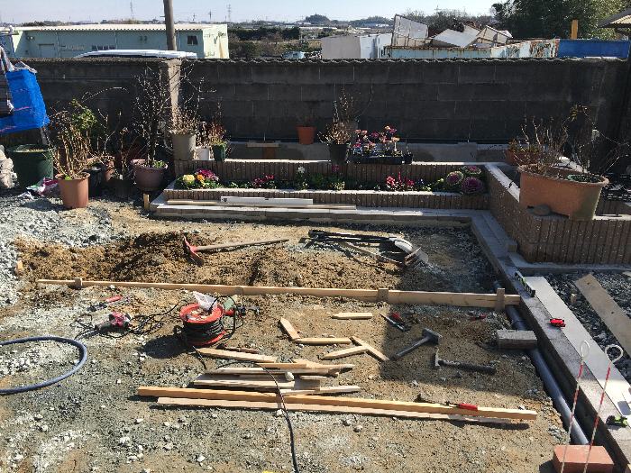 で、セメントレンガを並べ終えて後午からいよいよ型枠の