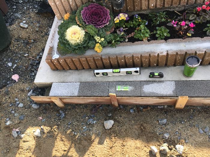 レンガを乗せ、水平器で水平(若干の手前下がり克左上がり)