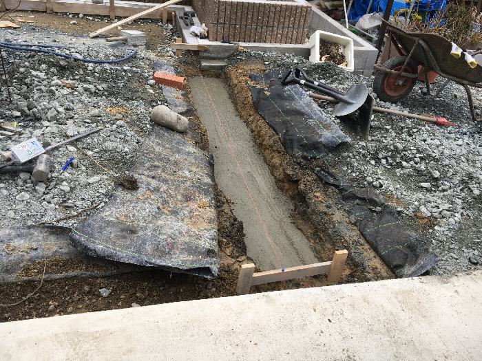 手前の業社施工の土間コンまでの間に境界となる土留めを