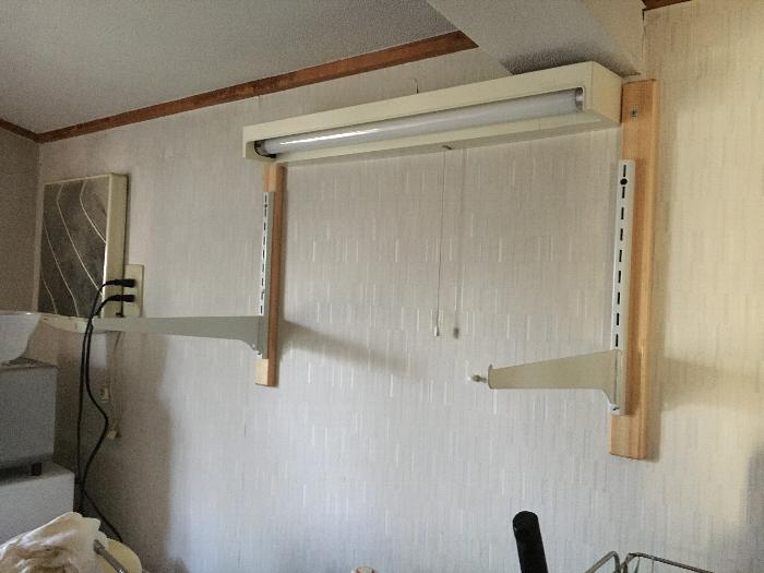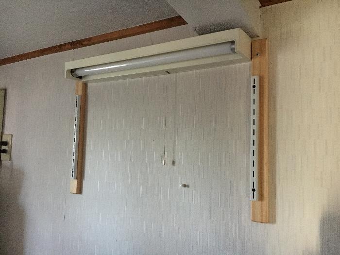 桧の土台に固定するレールラックとパイン集成材の棚板を
