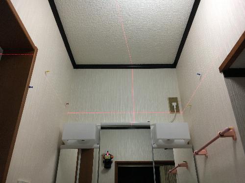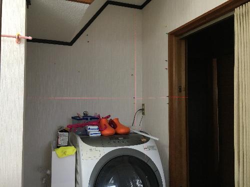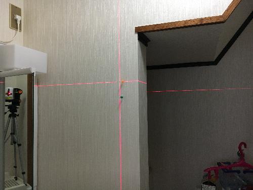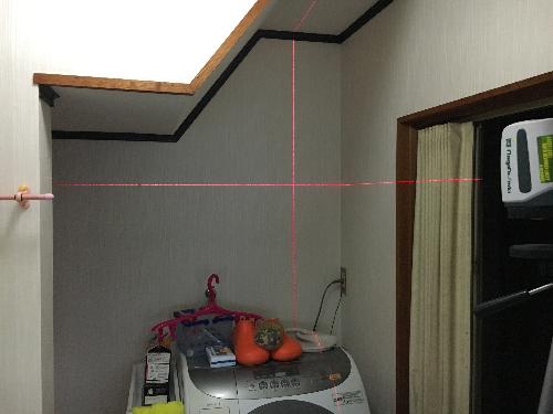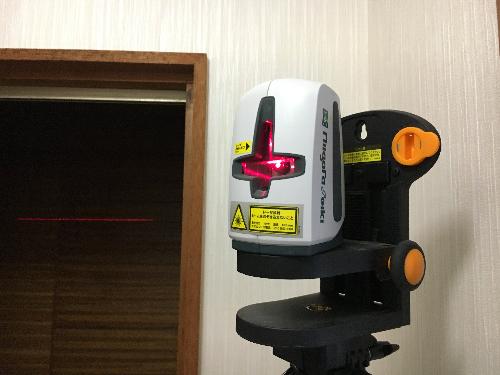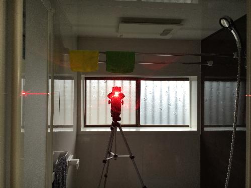 レーザーレベルは浴室の中に置いて三脚にセット。