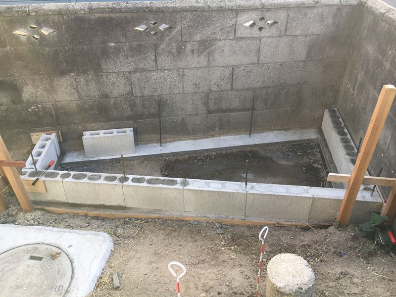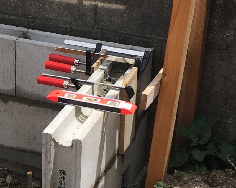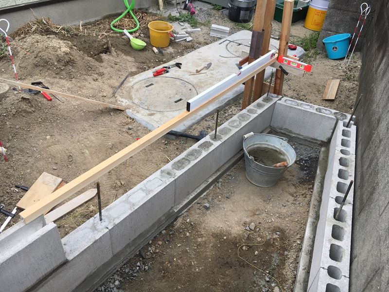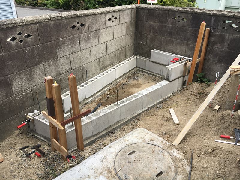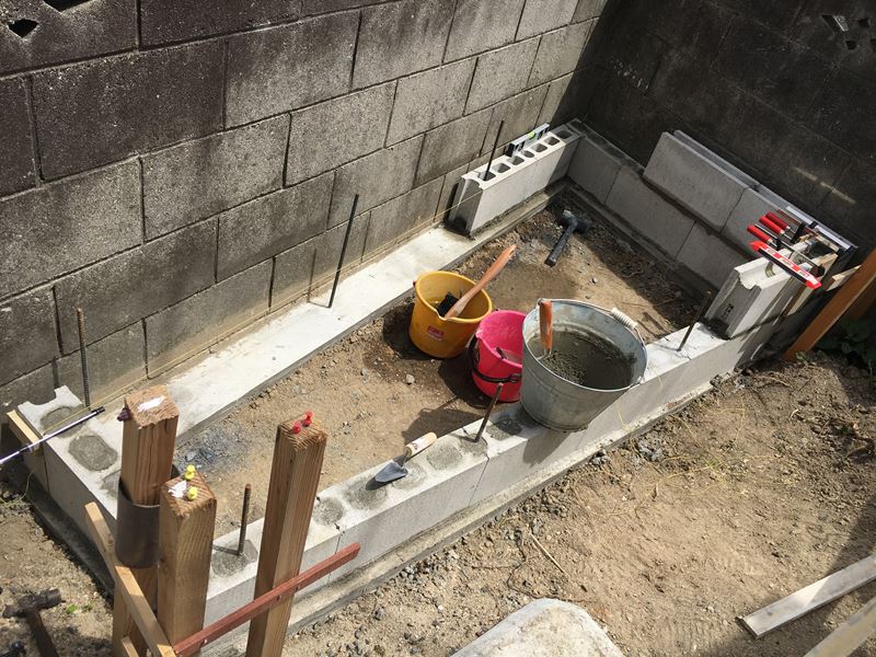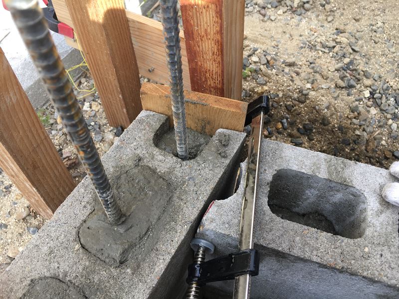 で、曲がり角のブロックは鉄筋を通すためにモルタルが
