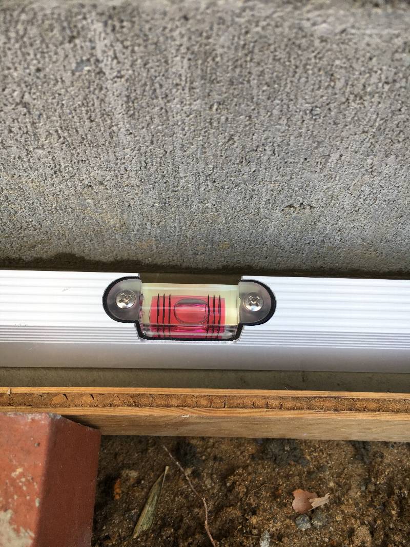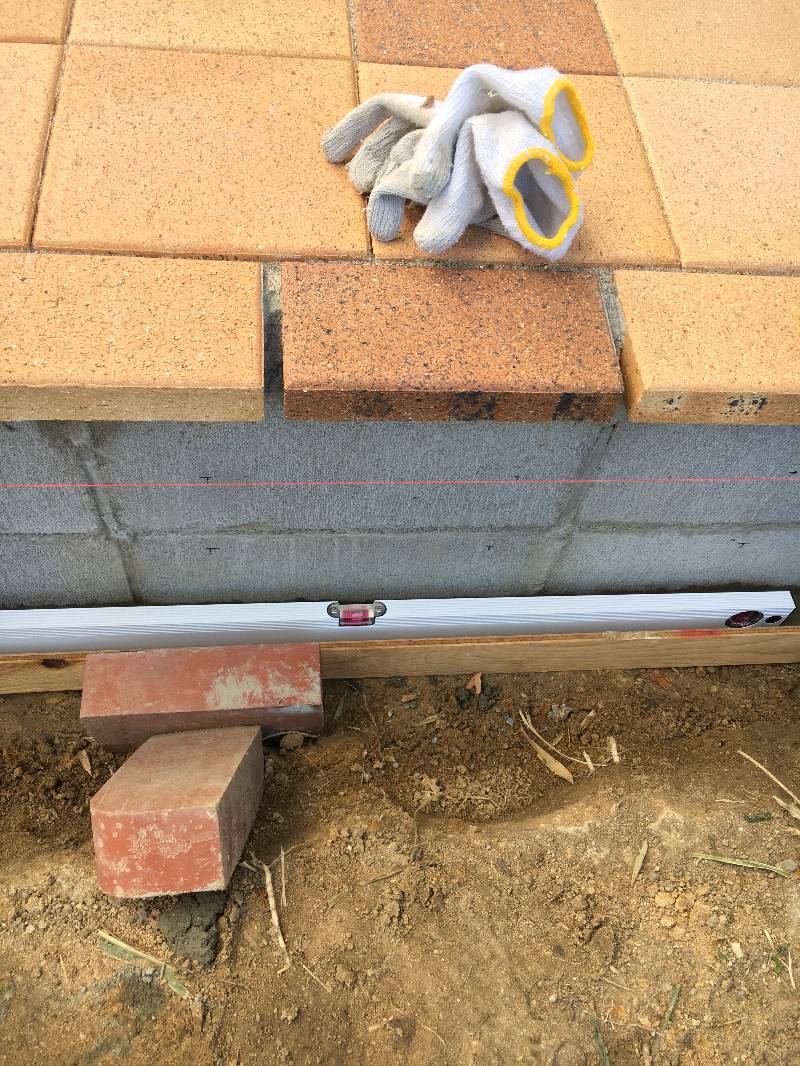 側面レンガが乗る基礎の平行も確認しました。