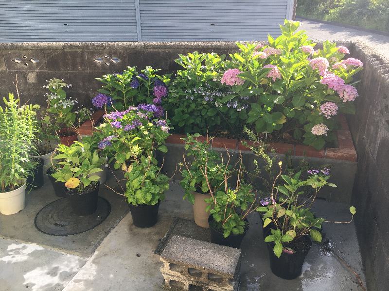 裏庭のブロック花壇の紫陽花が
