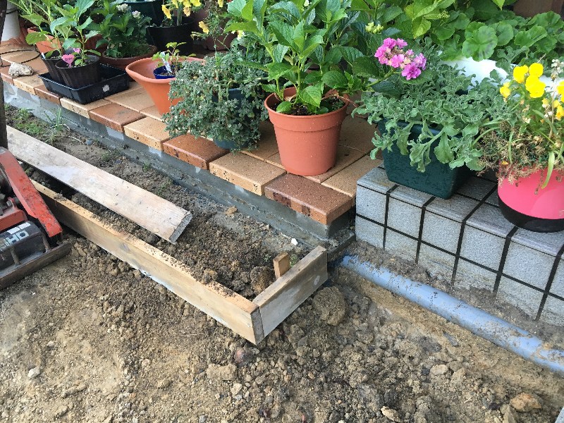 左写真では私の「レンガデッキ」の最も基礎が浅い部分の