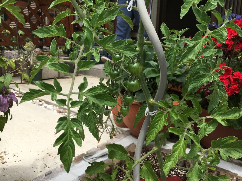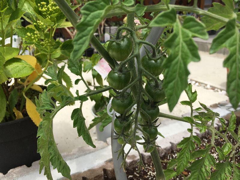 おっ!初孫Reo君のミニトマトに実が。