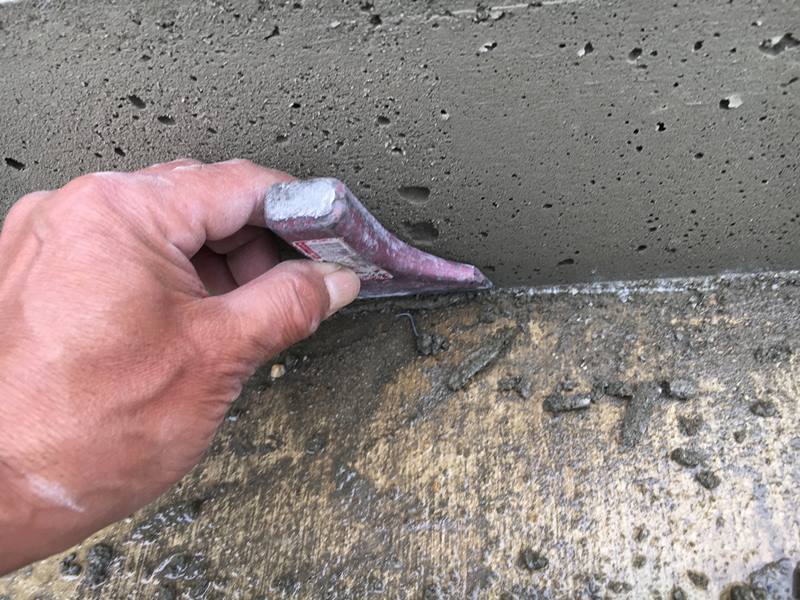 型枠の下辺りの隙間から流れ出たモルタルをタガネで耳切り