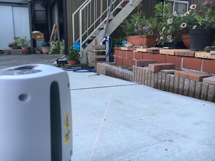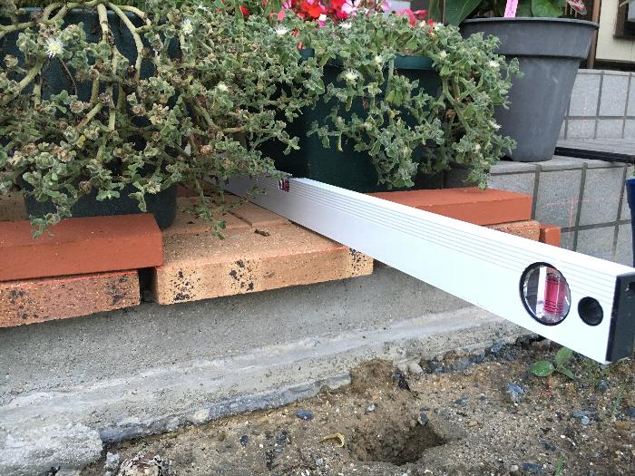 先ずは900ミリの水平器をアンバイ良くレンガデッキの上で