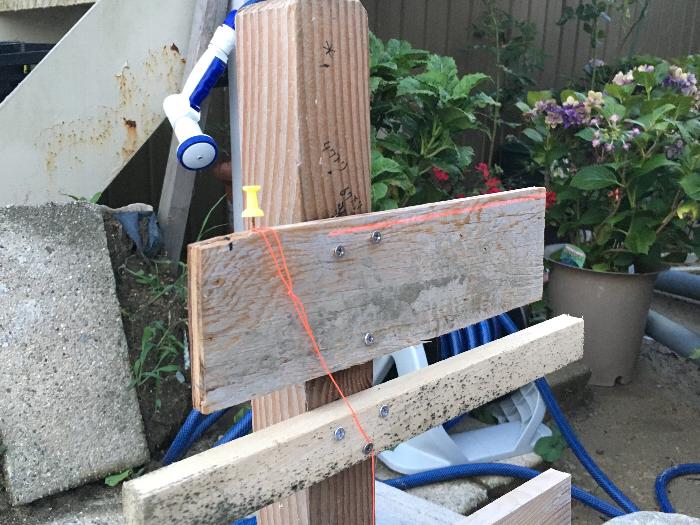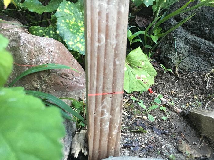 ここは玄関ポーチ側の杭にレベルを記しているところです。