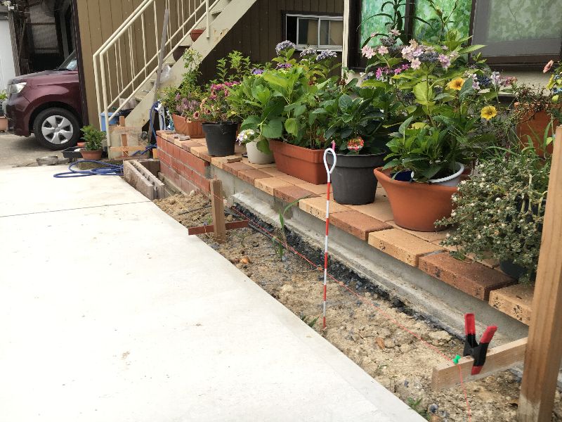むき出しの基礎の方が高くなってしまう為60ミリ厚のレンガで